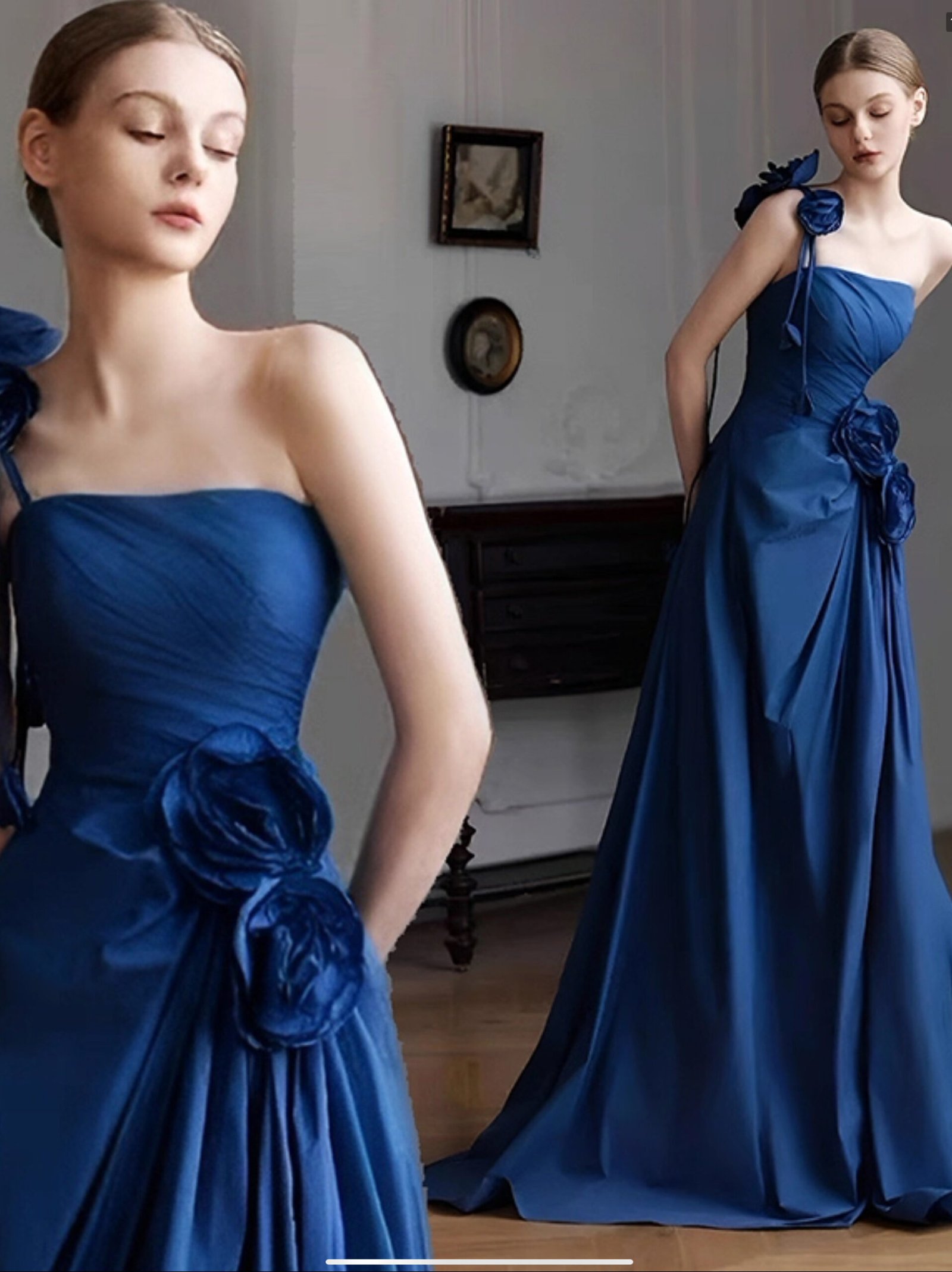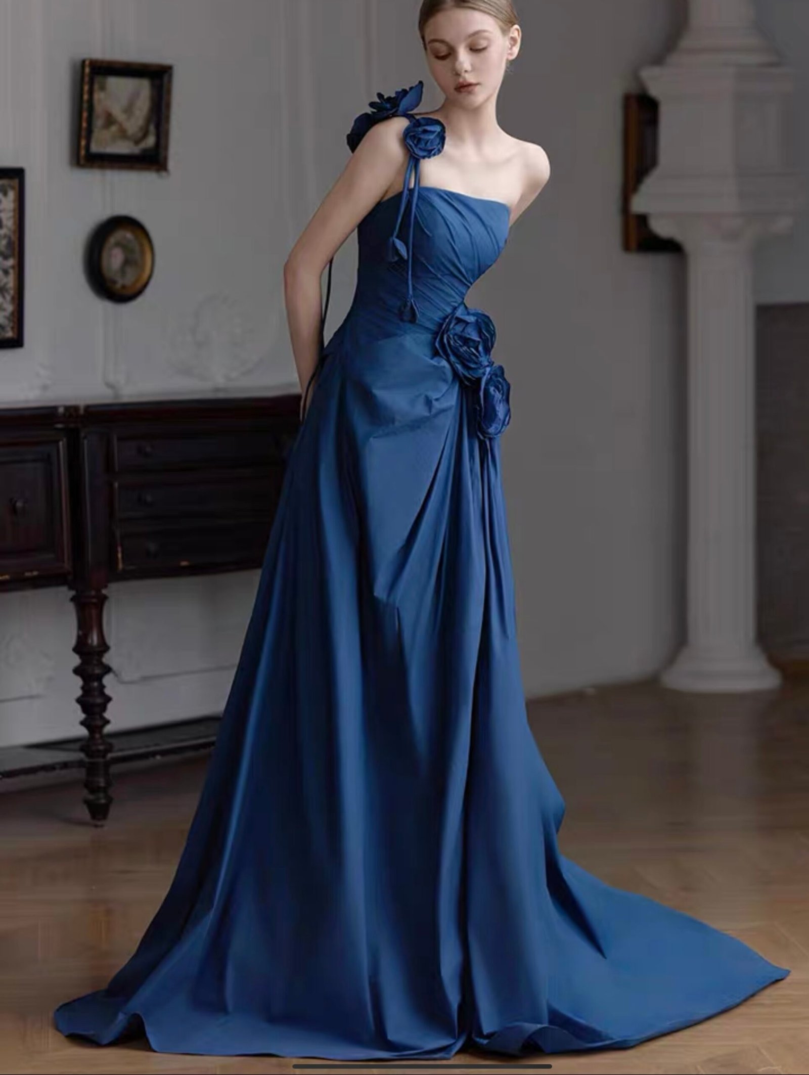 تألقي بأناقة خالدة مع فستان الأزرق الملكي. مصمم بكتف واحد مصنوع من قماش حريري فاخر بملمس ناعم ولمعان أنيق. يتميز بتصميم غير متماثل مع حمالة كتف واحدة مزينة بوردة مصنوعة يدوياً. يأتي الصدر بتفصيل ضيق يبرز القوام، ويتدرج إلى تنورة طويلة مع طيات أنيقة تمنح إطلالة انسيابية. الخياطة الدقيقة والتفصيل المتقن يضمنان ملاءمة مثالية وإحساساً فاخراً على البشرة.